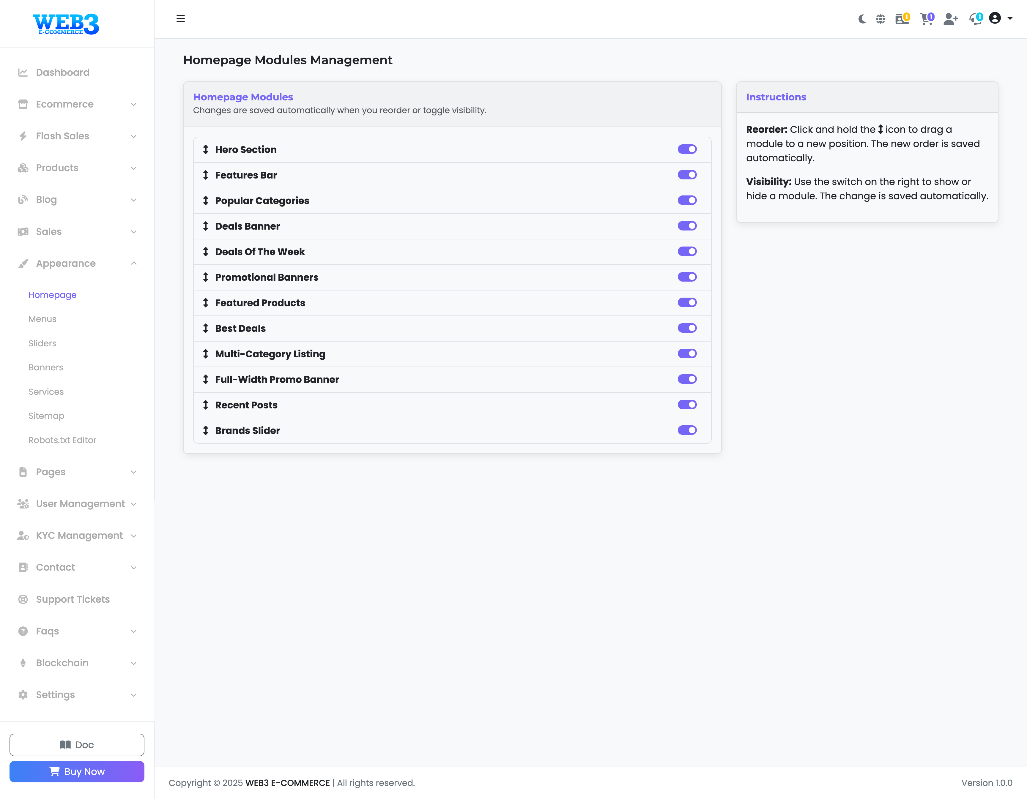 Important: All changes on this page are saved automatically and instantly. There is no "Save" button. As soon as you reorder or toggle a module, the change is applied to your live website.