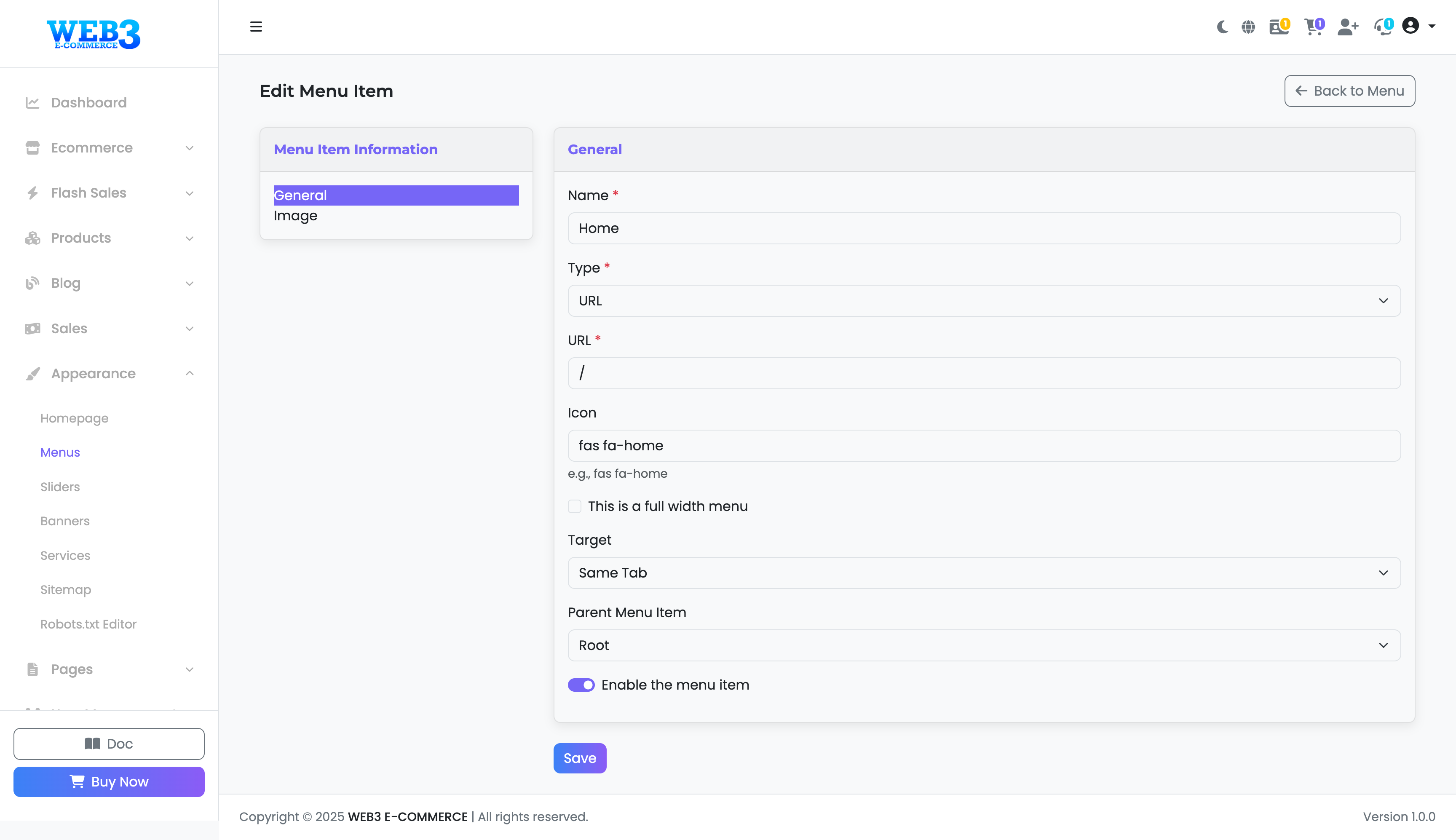 for external sites. - Icon: You can add an icon next to the menu name (e.g., Font Awesome classes like