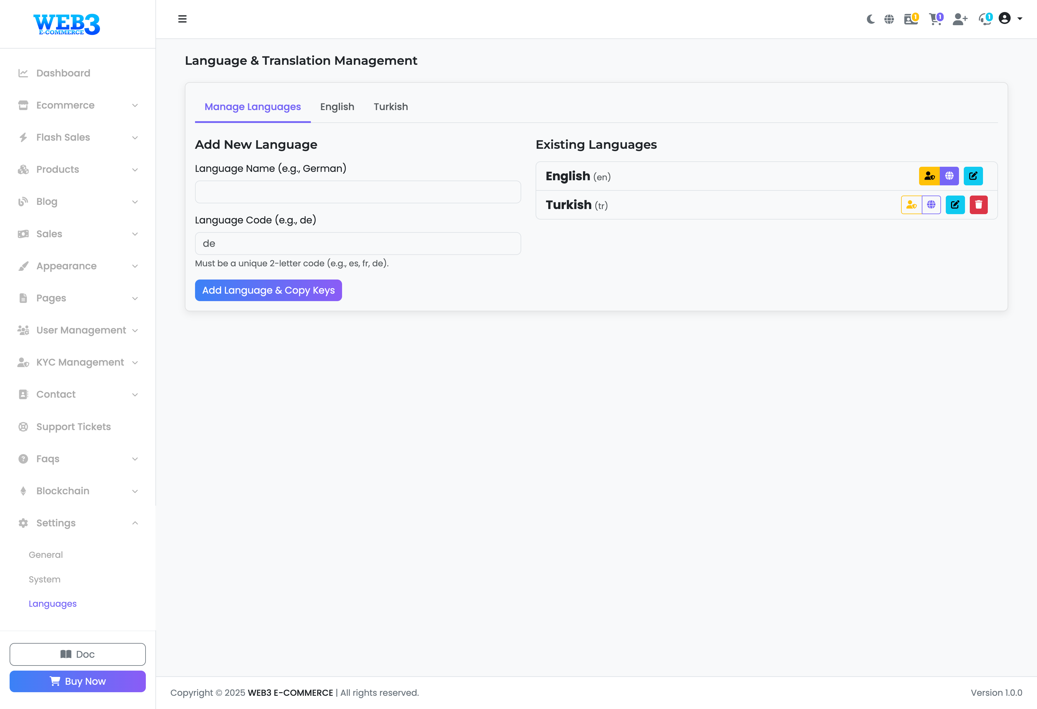 This section allows you to add new languages to your site, making your platform truly multilingual. You can also manage existing languages by setting a default, editing translations, or deleting them.