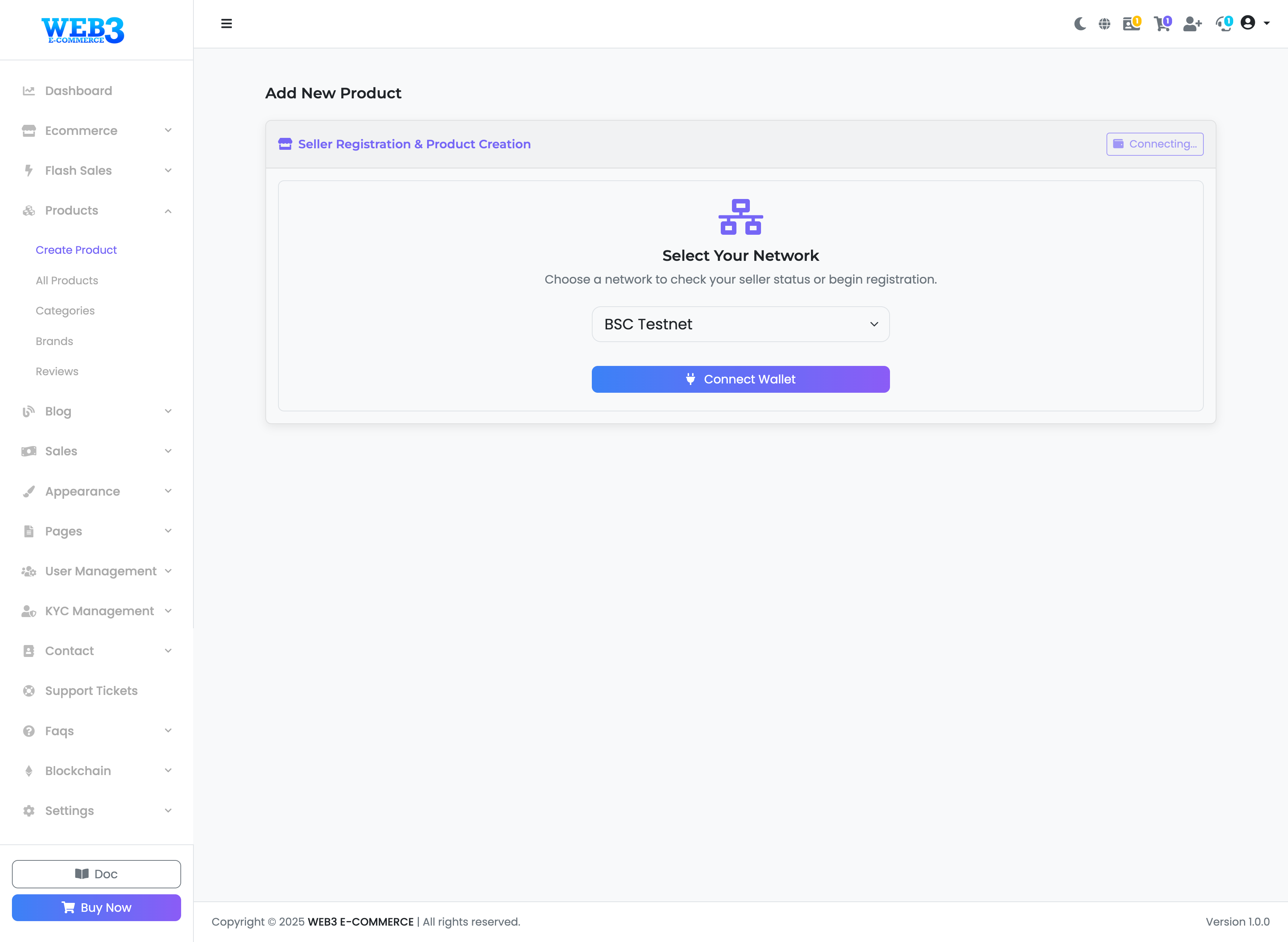 Note: If you later wish to add a product on a different network (e.g., you registered on BSC Mainnet but now want to sell on Ethereum), you must return to this page, select the new network, and complete the registration process again for that network.