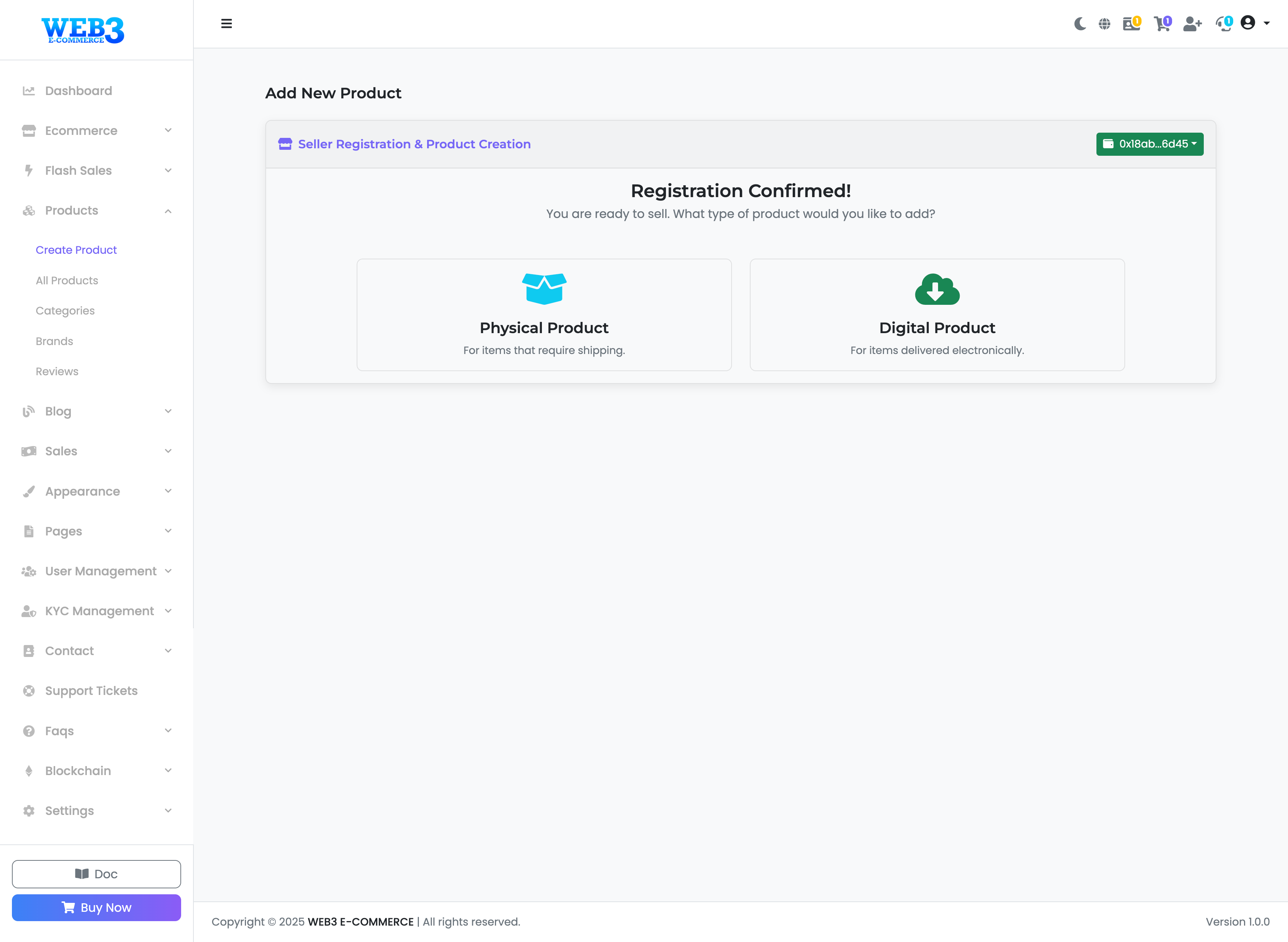 The "Create Product" page is your starting point for listing items on the marketplace. Before you can add a product, you must first register your wallet as a seller on the specific blockchain network where you intend to list the item.