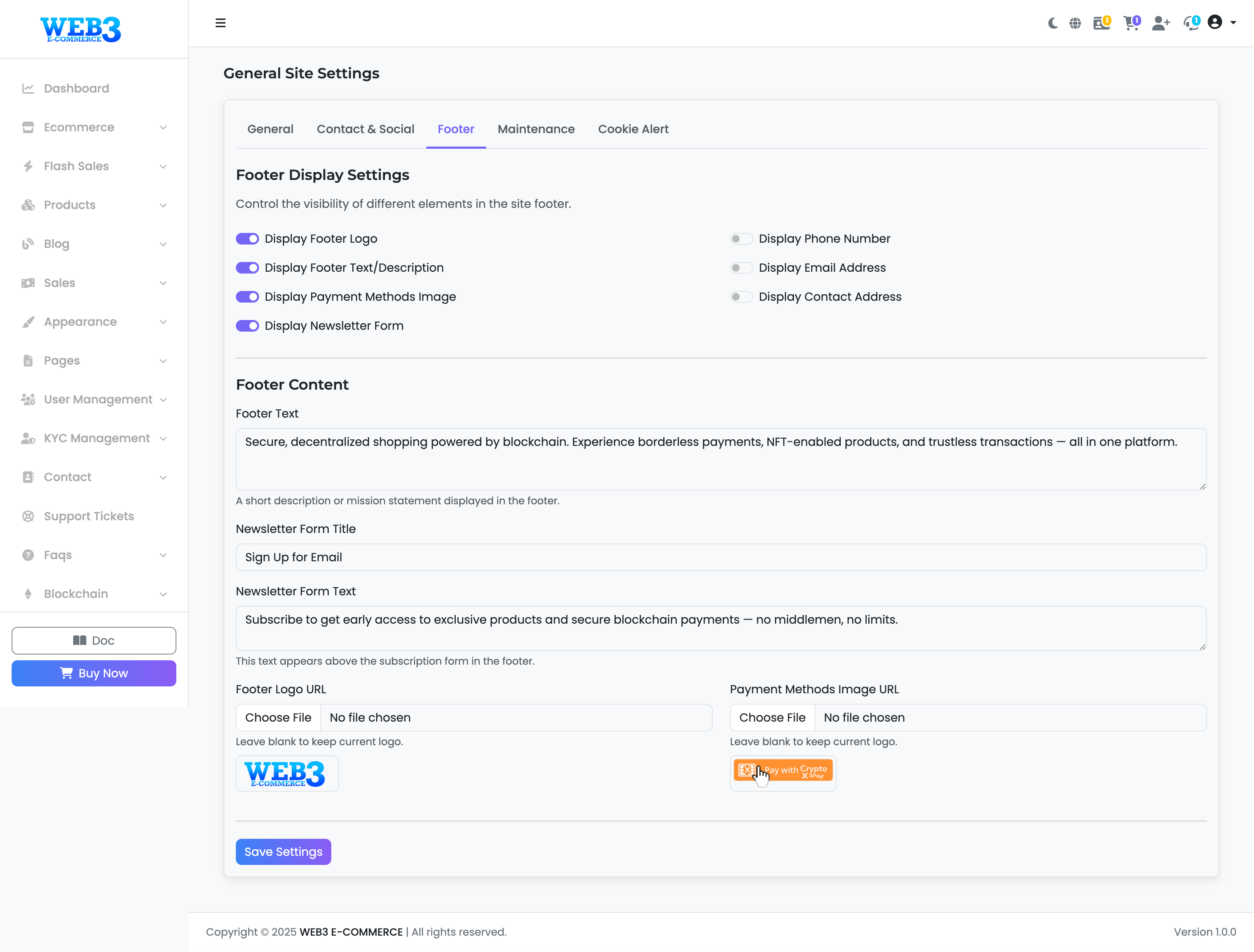 - Display Newsletter Form: Show or hide the email subscription form in the footer.