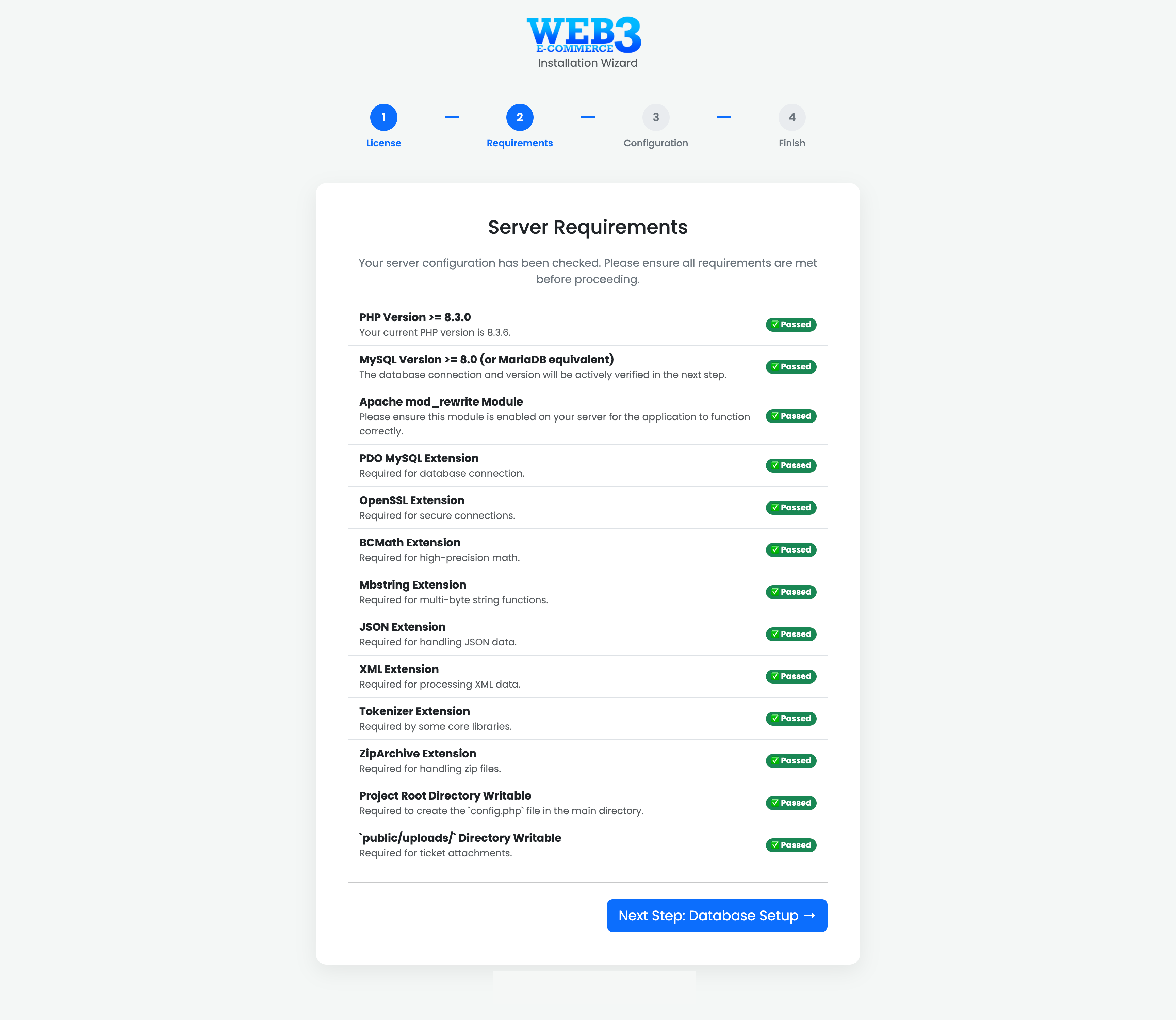 In this step, the installer automatically checks your server environment to ensure it is compatible with the script. For the application to run smoothly and securely, all requirements must be met.